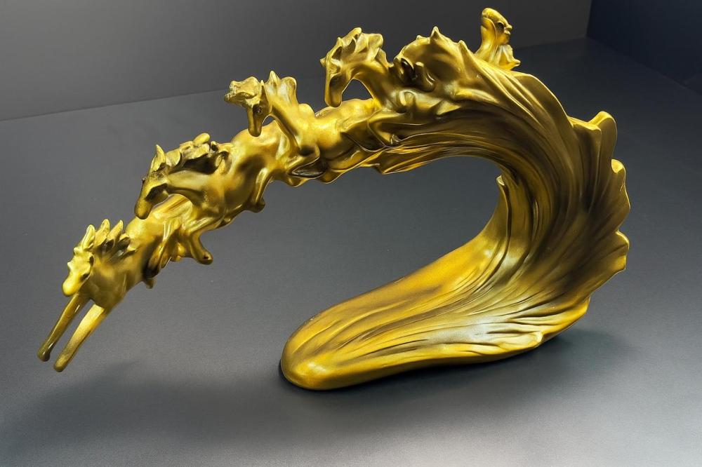 مجسّم فني أنيق يصوّر مجموعة من الخيول تنطلق بقوة وسط موجة ديناميكية 🐎✨