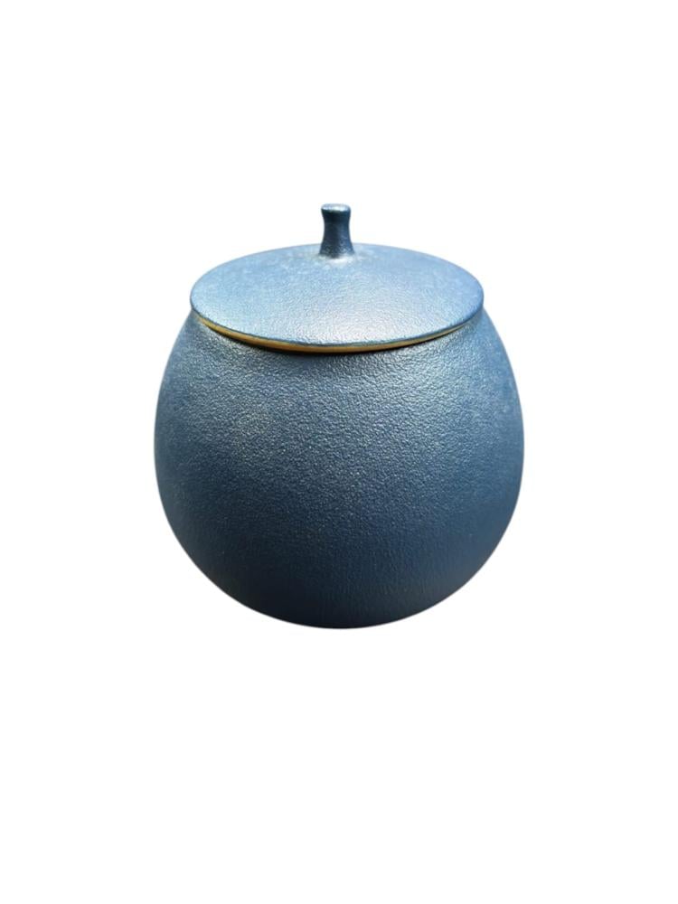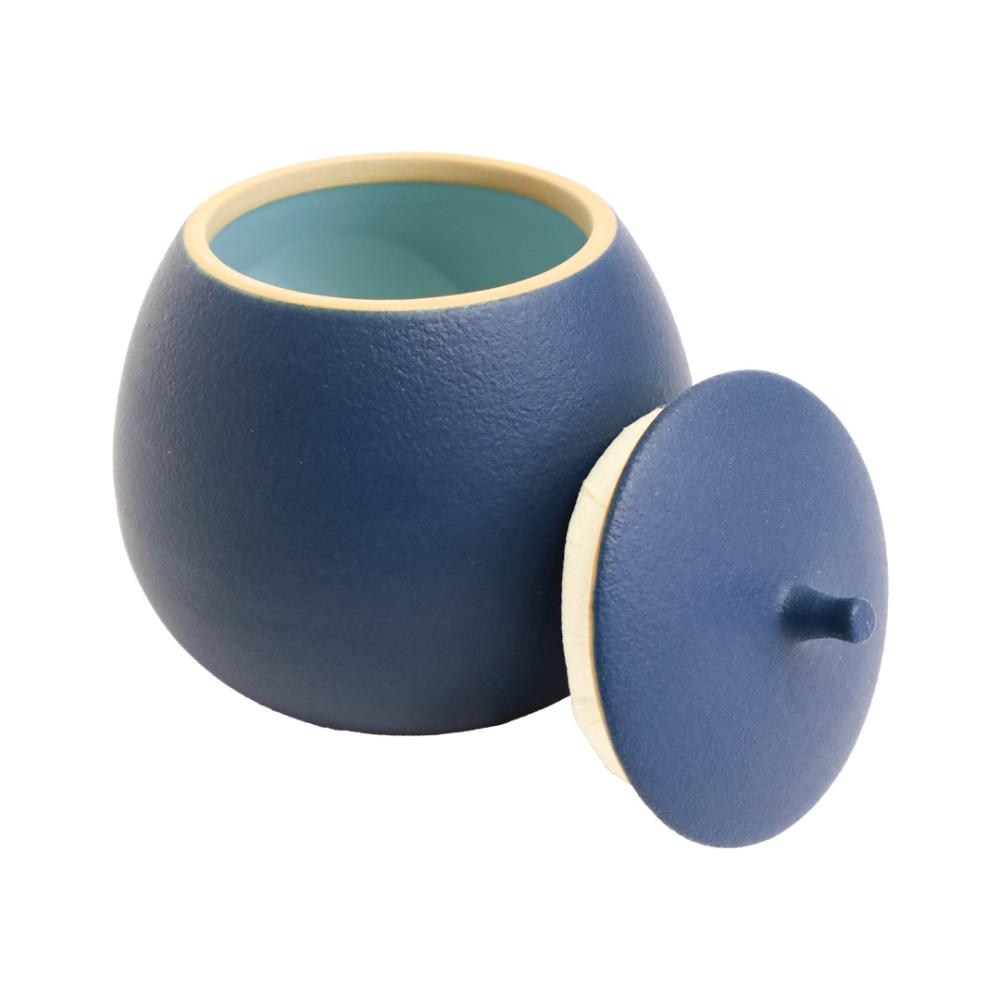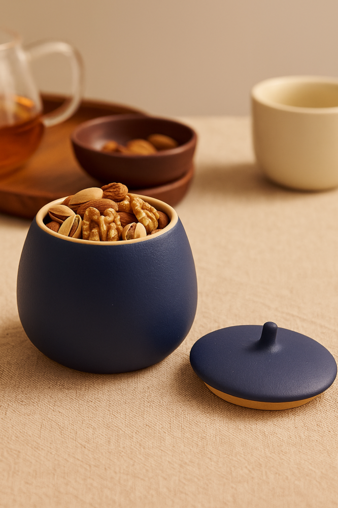 تميّزي بذوق فني عصري مع هذه العلبة الخزفية الفريدة التي تجمع بين اللون الأزرق الملكي الغامق من الخارج وتدرجات التركواز الناعم من الداخل، بلمسة نهائية غير لامعة تضفي شعورًا بالفخامة والرقي. تأتي بغطاء أنيق بلمسة متجانسة مع التصميم، لتكون مثالية للتقديم أو كقطعة ديكور مميزة في أي مساحة.