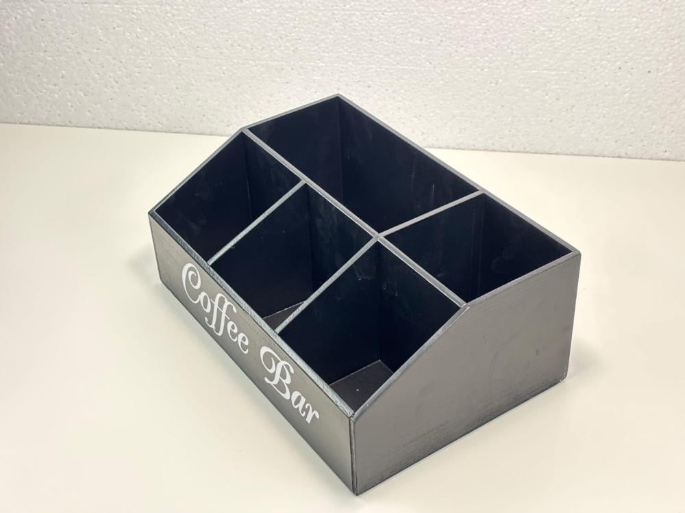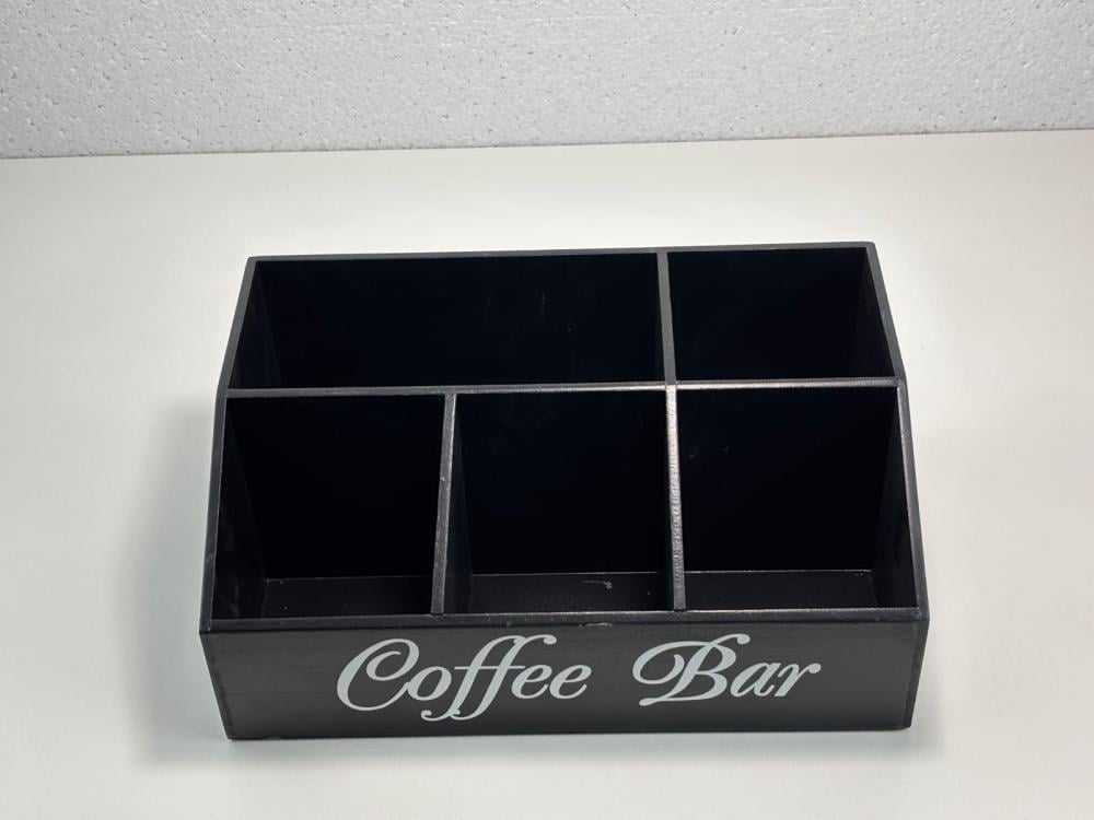 منظم خشبي بلون أسود أنيق مزين بعبارة “Coffee Bar”، يحتوي على 5 تقسيمات عملية لترتيب كبسولات القهوة، السكر، المحليات، الملاعق أو الأكواب الصغيرة.